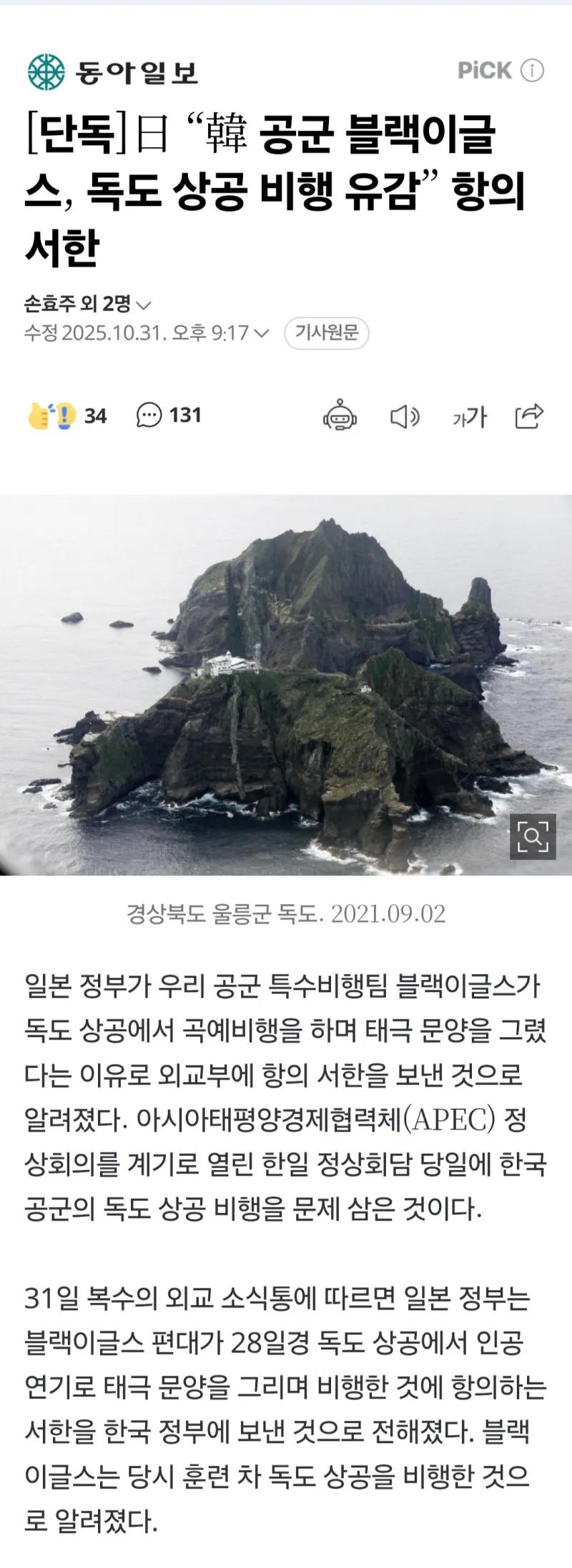 일본, “한국 공군 블랙이글스, 독도 상공 비행 유감” 항의서한.news