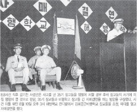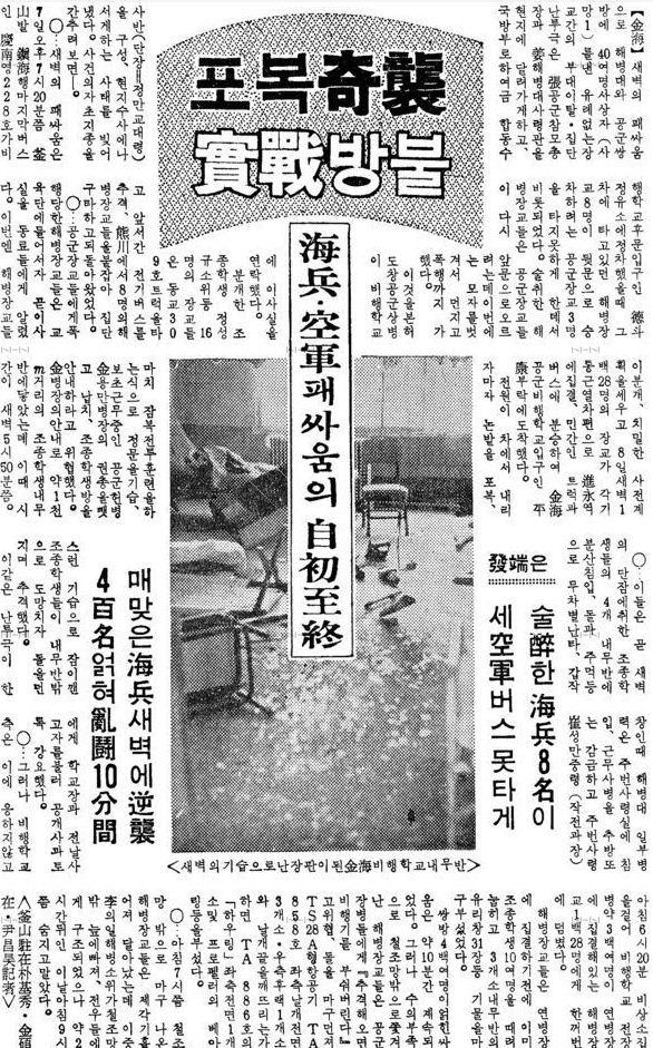 선요약 1. 해병대가 공군을 폭행했는데 역으로 쳐맞음 2. 위 사건에 화나서 129명이 공군학교를 습격했으나 역으로 쳐맞음 3. 이 과정에서 비행기 2대 파손, 공군학교 시설파괴 해병대소위 1명이 사망함, 근데 사실상 아무도 처벌 안받음 소위 교육과정중 일어난 일이다. 외박을 마치고 버스 막차를 타려는 공군소위 3명을 술취한 해병소위 8명이 버스에 타지 못하도록 시비를 걸었고 끝내 폭행한 후 버스 밖으로 내쫒았다. 이를 목격한 공군상병이 해당사건을 비행학교에 알렸고 공군장교 16명이 군용트럭을 타고 해당 버스를 추적, 해병대원을 끌어내 집단구타를 하였다 해당 해병대소위들은 학교로 복귀 후 해당 사실을 알렸고 이에 분개한 해병대장교들은 진영역에 집결해 129명이 무임승차하여 공군학교 입구인 평강마을에 도착 보초근무를 서고있는 헌병을 폭행하여 권총을 빼앗고 내무반으로 안내하라고 협박한다 이후 자고있는 공군장교들을 무차별적으로 폭행하고 상황실로 들어가 근무자를 추방하고 폭행하며 사건주동자를 끌고오라고 협박 이후 잠에서 깬 공군장교 300여명이 달려나와 해병대를 집단구타하기 시작, 해병대원들은 도망가며 '쫒아온다면 비행기를 부숴버리겠다'고 협박하였으나 그래도 쫒아오자 돌맹이를 주워 비행기 2대를 심각하게 파손시킨다. 이어진 추격전 끝에 해병대원들은 철조망을 넘어 도망갔으나 이 과정에서 해병대 소위 1명이 부대근처 늪에 빠져 익사하는 일이 일어남 결과적으로 비행기 2대 파손, 공군학교 1층 시설물 전손, 중상 39명, 사망 1명의 엄청난 손실이 일어남 그런데 월남전이라는 특수상황으로 인해 장교인력이 많이 모자랐던 해병대는 핵심주동자인 전도봉 소위만 현역부적합 판정을 받고 나머지 인원들은 현역으로 이상없이 복무하게된다. 이후 전도봉소위는 해병대 38기로 다시 임관하게 되고 해병전우회는 해당사건이 있던 35기 동기로 인정하고있다 | 제목 | 글쓴이 | 조회수 |