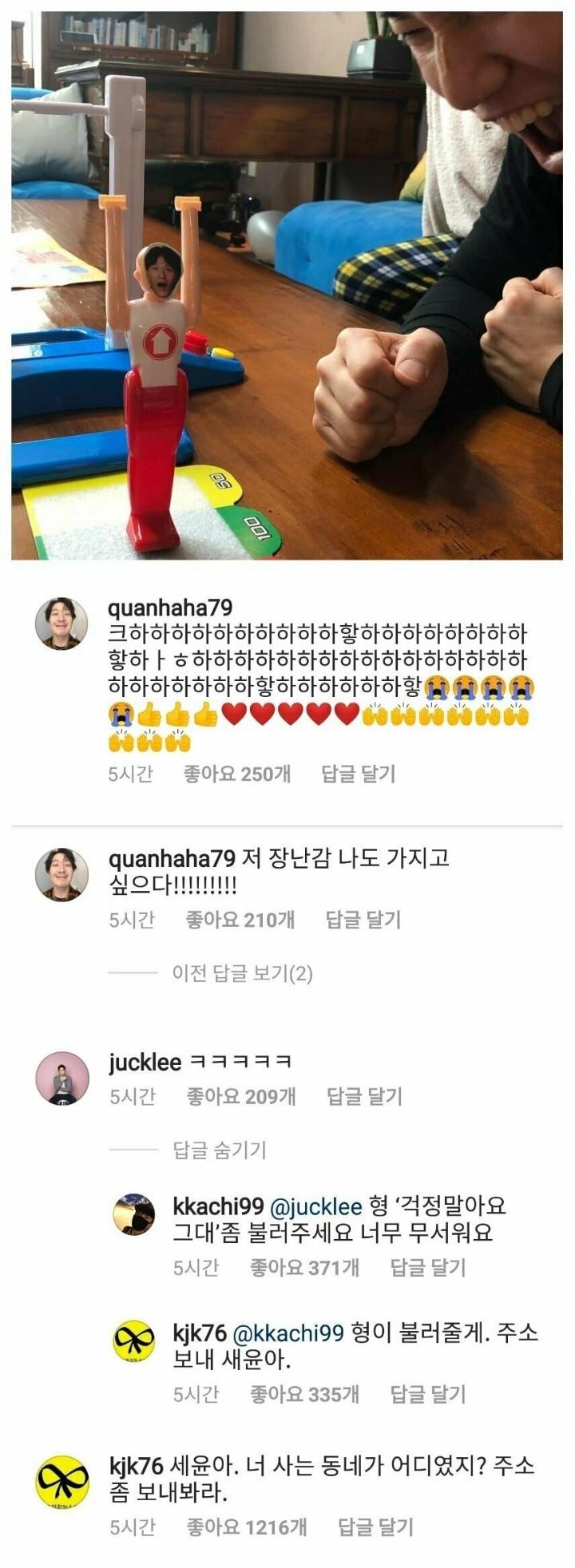 # 김종국 불막창 사진을 가지고 놀이 중인 유세윤 & 그 아들 # 유세윤: 형 '걱정 말아요 그대' 좀 불러주세요. 너무 무서워요. # 김종국: 형이 불러줄게. 주소 보내, 세윤아 # 김종국: 세윤아, 너 사는 동네가 어디였지? 주소 좀 보내봐라 Game over | 제목 | 글쓴이 | 조회수 |