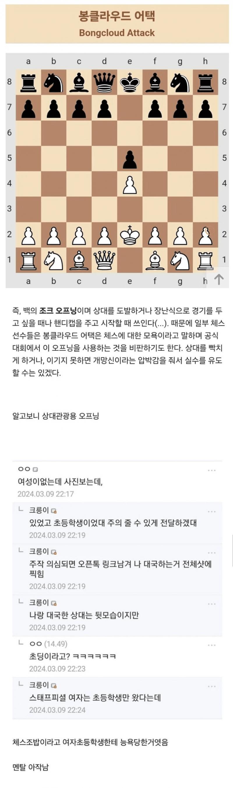 체스 오프대회 갔다가 여초딩한테 3번 털리고 면전에서 '개못하네 허접~' 당함 ㅋㅋ 레이팅 700 = 상위 60% 롤 실버정도라고  | 제목 | 글쓴이 | 조회수 |