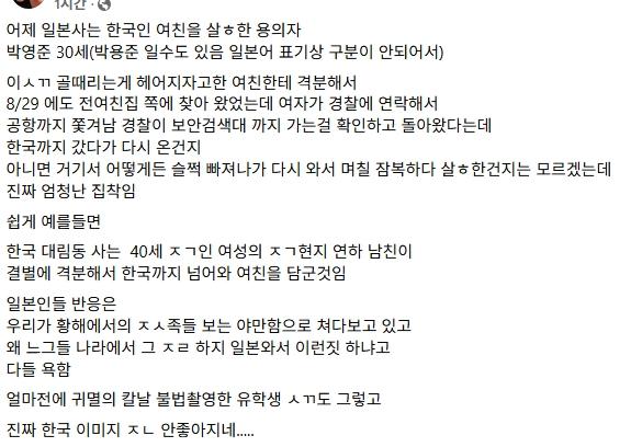 일본 도쿄 세타가야구 주택가에서 1일 40대 한국인 여성을 살해한 것으로 보이는 30대 한국인 남성이 도쿄 하네다공항에서 검거됐다고 nhk 등이 보도했습니다. 피해 여성은 오후 1시 30분쯤 피를 흘린 채 길가에 쓰러져 있는 상태로 발견됐으며 병원으로 이송됐으나 사망했습니다. 이 여성은 발견 당시 목에 자상으로 추정되는 상처가 있었습니다. 일본 경찰은 살인 혐의로 이 남성의 행방을 쫓았으며 하네다공항에서 신병을 확보했습니다. | 제목 | 글쓴이 | 조회수 |