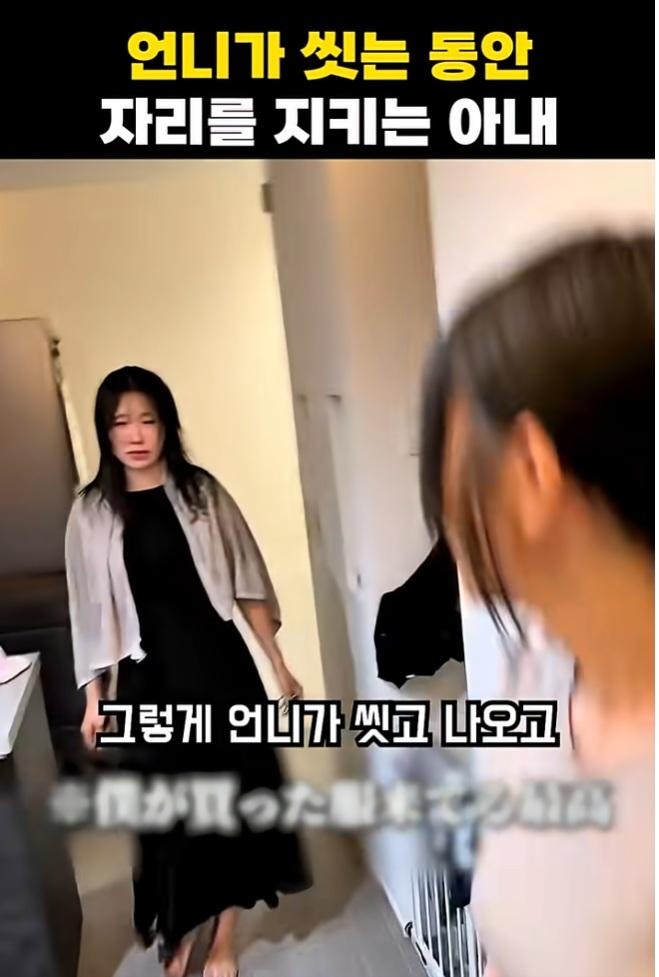 언니가 샤워중이라서 막고 있는 아내  남편이 처형을 친근하게 부르자